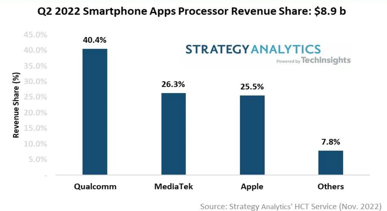 Qualcomm sigue siendo el líder en el mercado del procesador de solicitudes de teléfonos inteligentes con una participación del 40%de los ingresos, seguido de MediaTek (26%) y Apple (25.5%).