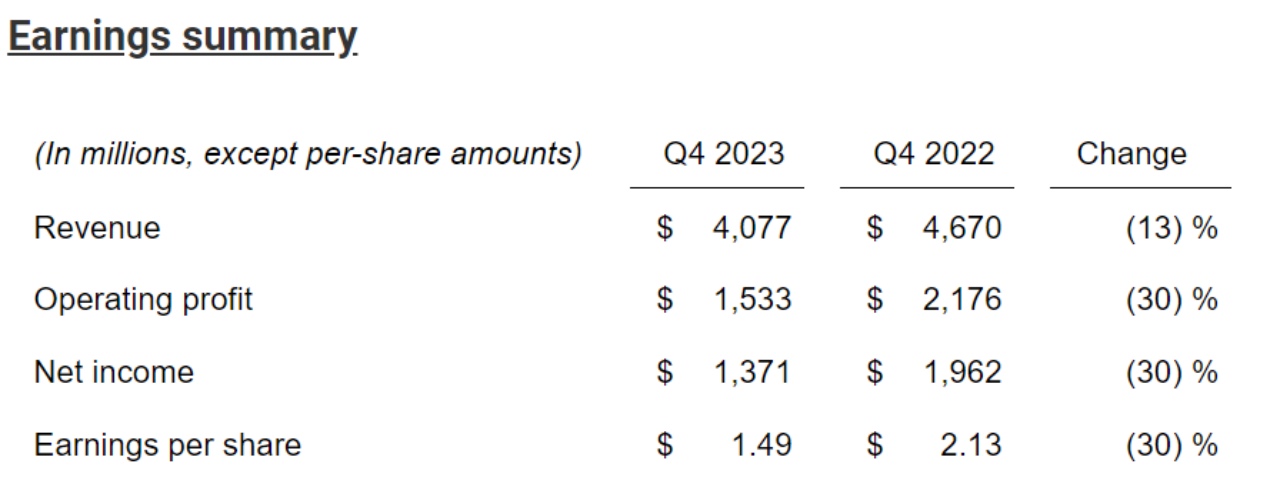 Los ex instrumentos de Texas reportaron ingresos de 2023Q4 de $ 4.08 mil millones, un 10 por ciento menos que el trimestre anterior y 13 por ciento desde el mismo período del año pasado;La ganancia neta fue de $ 1.37 mil millones y las ganancias por acción fueron de $ 1.49;La ganancia operativa fue de $ 1.5 mil millones, o el 38 por ciento de los ingresos, un 30 por ciento menos que el mismo período del año pasado.