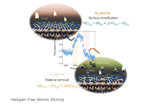 El equipo, dirigido por la colaboración de la Universidad de la Universidad de Ming Chi de la Universidad de Nagoya, diseñó un método cíclico de dos pasos que reemplaza los halógenos con plasmas de nitrógeno y oxígeno.En la primera etapa, los iones n⁺ bombardean la superficie HFO2, uniendo el nitrógeno a la película.En el segundo, un plasma O2 elimina la capa unida a nitrógeno a través de una reacción autolimitada.Cada ciclo elimina solo 0.023 a 0.107 nanómetros de material, lo que permite la precisión subatómica.
