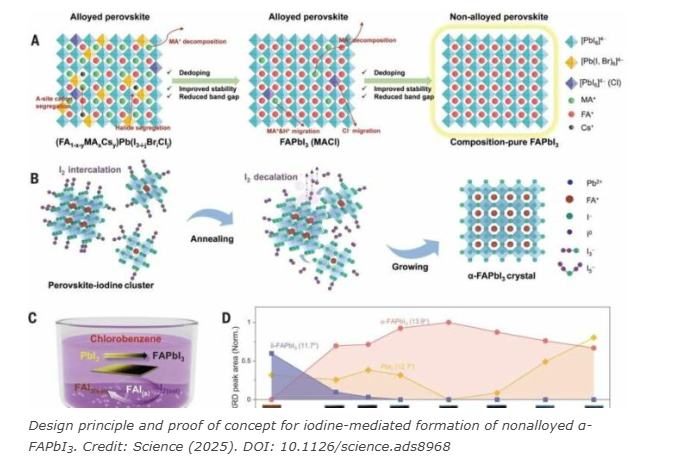 En este enfoque, la fuerte interacción entre el yodo cogenético (I₂) y I⁻ forma iones de polyioduro, alterando el FAI + PBI₂ → FAPBI₃ la ruta de reacción a Fai₃ + Pbi₂ → FAPBI₃ + I₂.Esta modificación ayuda a superar las barreras para la formación de α-FAPBI₃.