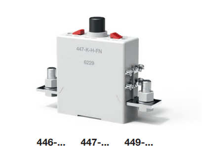 La información de pedido incluye números de tipo (446 para una curva característica rápida, 447 para curva característica de retraso medio, 449 para curva característica tardía), diseño terminal (terminales de tornillo M12, inserción de tuercas M8), liberación manual (H estándar para 447, FN General Applicationpara 447 y 449), y características opcionales como contactos auxiliares (SI 2) y viaje remoto (voltaje de bobina de 24 V de FA24 DC).