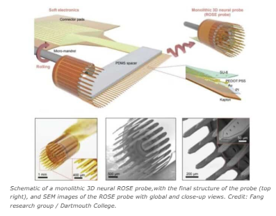 Una nueva generación de sondas cerebrales podría transformar la neurociencia al permitir a los investigadores mapear la actividad neuronal en tres dimensiones en lugar de a lo largo de planos planos.Los científicos de Dartmouth College, la Universidad de Pittsburgh, la Universidad Estatal de Oklahoma y los colaboradores han desarrollado una técnica para enrollar la electrónica suave plana en formas cilíndricas, creando sondas neuronales 3D que superan las restricciones de los diseño 2D convencional.Informado en la electrónica de la naturaleza, esta innovación, llamada Rose o Rolling of Soft Electronics, ofrece una forma de registrar datos más ricos con menos estrés tisular.